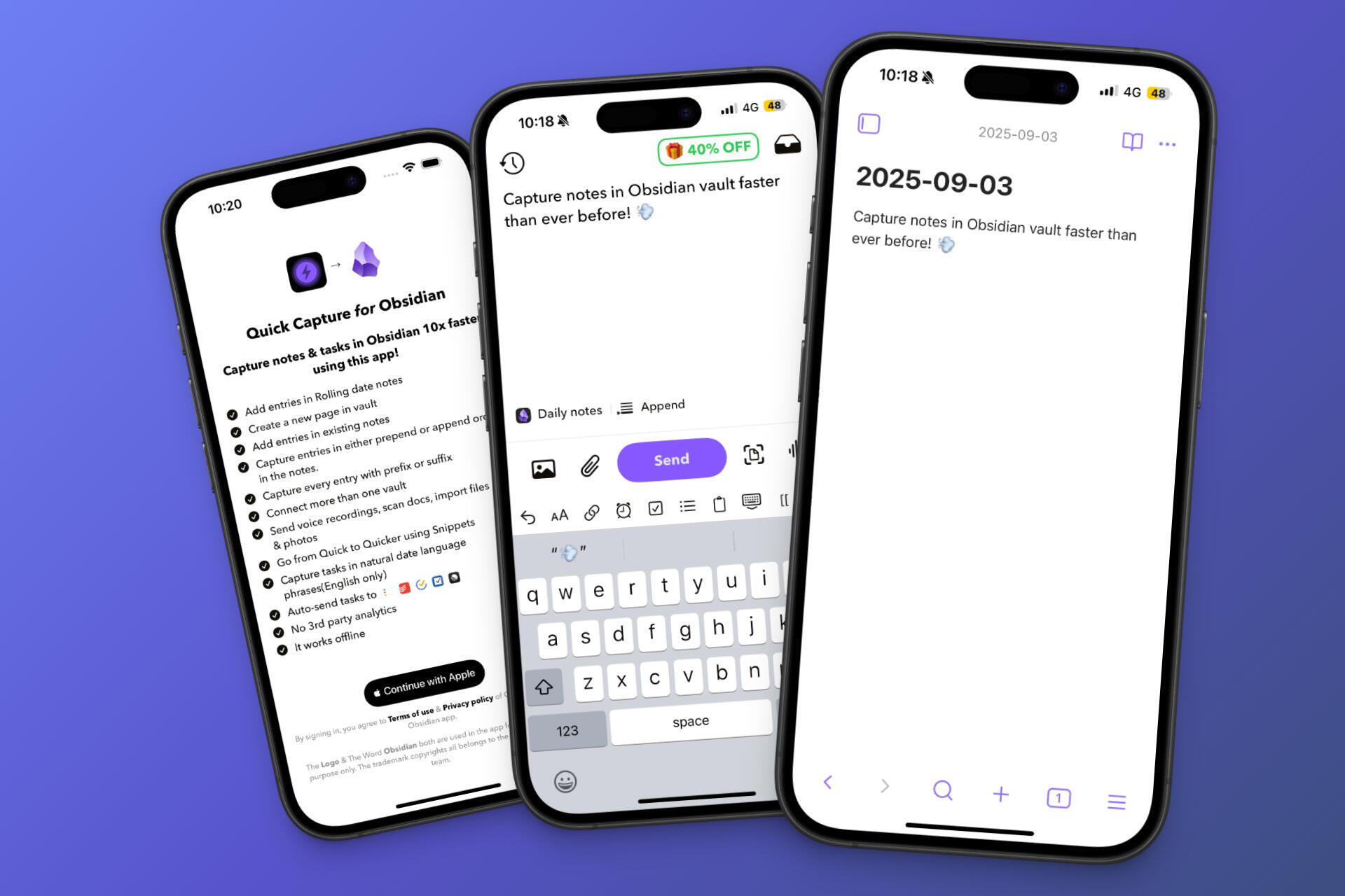 Just open β†’ capture β†’ send to any of your second-brain apps β€” Obsidian, Capacities, Notion, Email to Inbox, Email to Apps, Webhooks, and 20+ more.It lets you think in motion, move at the speed of inspiration, and never lose a note to workflow friction again.